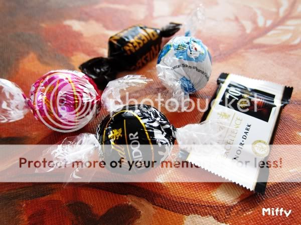 黑球球是 60% Cocoa, 扁pia pia滴是 70% Dark,粉球球是 raspberry flavor milk (情人节限量滴), 白球球是 milk shell white center , 躺在最后面滴是 Riesen caramel 滴,软软滴有点儿粘牙。